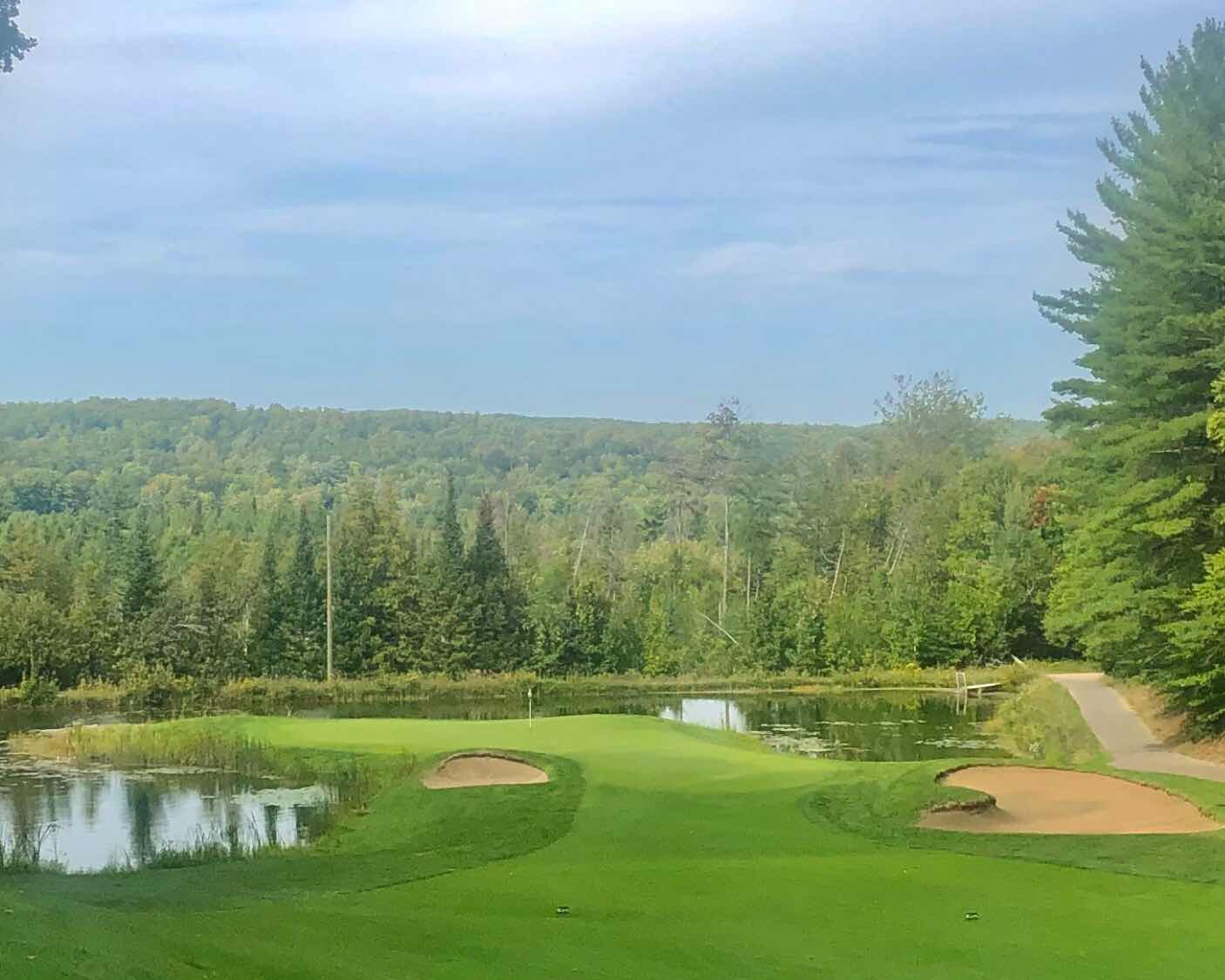 Masterpiece was designed in 1987 by Robert Trent Jones Sr. It was selected by Golf Digest as the second best new resort course that year. The setting is stunningly beautiful, rolling through the hills and valleys of the northern Michigan backwoods. The elevation change drops over 100’ on a few holes! On the spot of par three sixth, Jones told Harry Melling, owner of Sylvan Resort, that all he could see were treetops, thus inspiring the name change that we associate the Masterpiece with today.