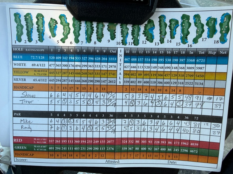 (We played the white tees at 5,987 yards. The gentlemen I played with really needed a combo tee since their length overwhelmed most of the holes. This course pushes the “play it forward” objective with the goal of getting people around quickly. We had a ton of birdies, excluding myself, with most of them coming on par fours. Besides eleven, the par fives were not so easy. Trevor had a great 74 with five birdies.)