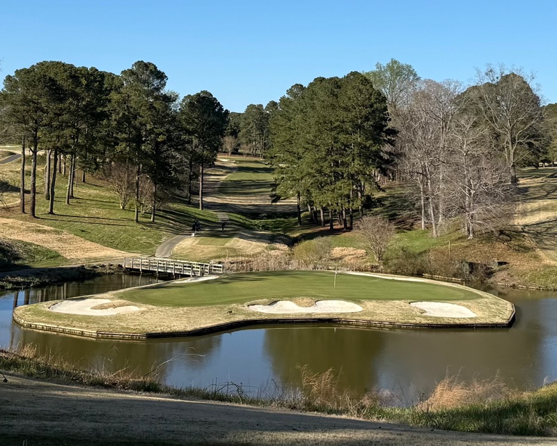 (The sixteenth is a 169/159 yard par three to an island green. The left half is just a sliver of putting surface while today’s pin is generously large. Note the par four seventeenth in the background. How cool is that view as the hole zooms through the trees and climbs the hill…