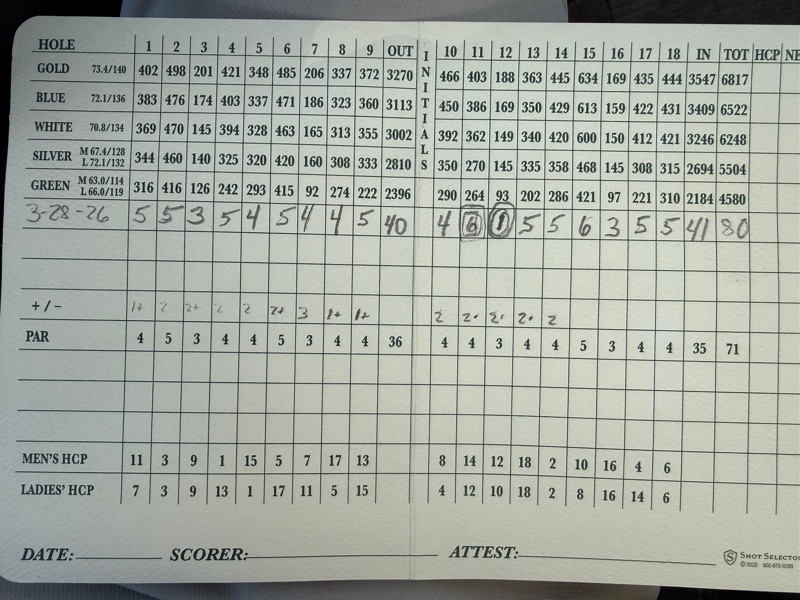 (I played the white tees by myself (6,248) which put a damper on my hole in one, however, is that the ultimate bounce back or what?! Double bogey- ace!! I’ll take -1 on these set of par threes. I’m still inconsistent with my driver which led to most of my bogeys. I paid $165 which is a fair price.)