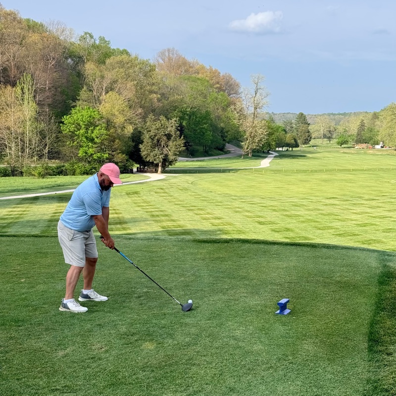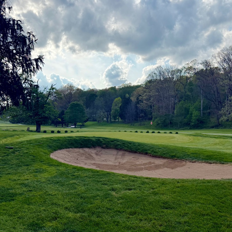 (We played the Black tees at 5,950 yards. Note the course and slope rating from those tees! 70.4 and 139! Yes it’s under 6,000 yards and a half stroke higher than its par 70. Unfortunately we had to tee off in slight rain, and only played five holes in okay conditions. At the tenth, a cold front came through dropping the temperature 10-15 degrees while it misted in a stiffening wind. If it wasn’t for my 500th blog, I’m not sure I would’ve played. It was really difficult. The cost was $175. Walter Hagen won the 1924 PGA Championship here with a 2&1 win over Jim Barnes.)