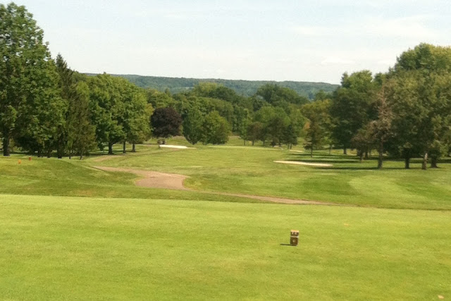 (The 438 yard ninth is a great hole! It doglegs just a bit the last fifty yards, so the second gets blocked out by the crossbunker unless the drive is down the right side.)