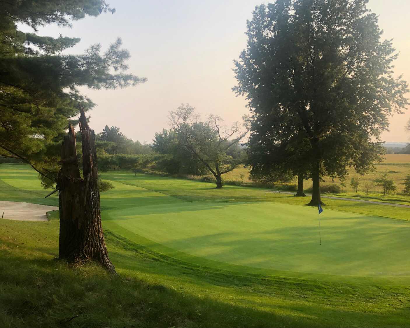(The uphill 408/405 yard par four finishing hole plays longer than it’s yardage. It is well bunkered in the front. The player will have to hit a long iron or hybrid high to attack the flagstick. Note the hillside out in the distance. Western Pennsylvania has great elevation change.)
