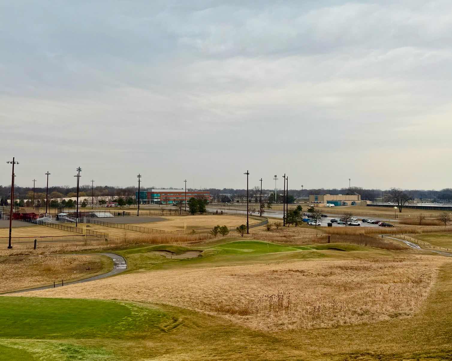 The centerpiece is the large hill that once was the top of the landfill. Both one and ten tee off from it while six and eleven bring the player back up. Holes seven, eight, and twelve play off the backside. With seven holes consuming this mountain, there’s a definite sense of community as you’re able to watch play at multiple viewpoints. In the summer, the ball fields are teaming with kids playing baseball below, another reminder of the connection between the golf course and the city.