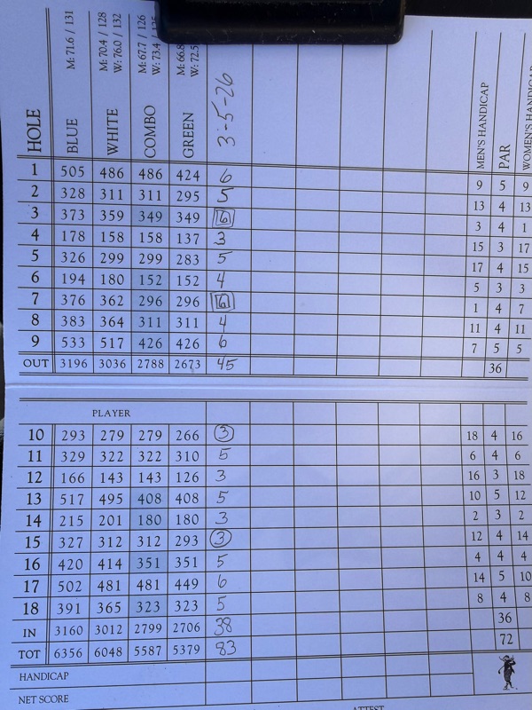 (We played the white tees at 6,048 yards. The two men I played with were Noah and Tom. Noah was a retired gentleman (and member) from Flint Michigan while Tom had a most peculiar job. He delivered fuel in Alaska for six months of the year. He had just taken up golf last October and was so smitten by it that he was playing every day during his off time.)