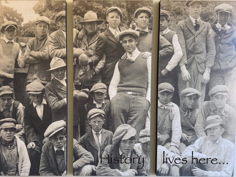 (This tri mural greets you as you walk to the pro shop. It’s a photo taken in 1917 of the caddies. Three of them would become professional golfers with the gentleman standing up in the center, Mortie Dutta, winning the 1955 Senior PGA Championship. However, in the front row, second from the left, is Alfred Santos, grandfather of the one and only Phil Mickelson.)